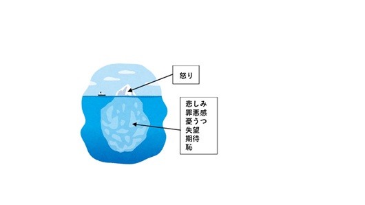 では、どうしたら怒りに振り回されずうまく付き合っていけるのでしょうか。ここで重要になるのは、怒りの奥にある本当の感情に目を向けることです。実は、怒りは氷山の一角にすぎません。
