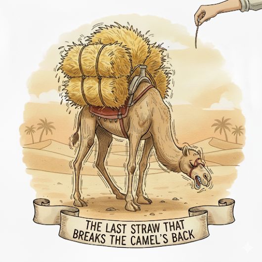 直訳すると「最後の藁1本がラクダの背骨を折る」という意味です。このイラストのようにラクダの背中にすでに荷物が大量に積まれているとき、最後に乗せる物が藁1本ほどの些細なものであっても、それをきっかけに簡単に崩壊してしまいます。